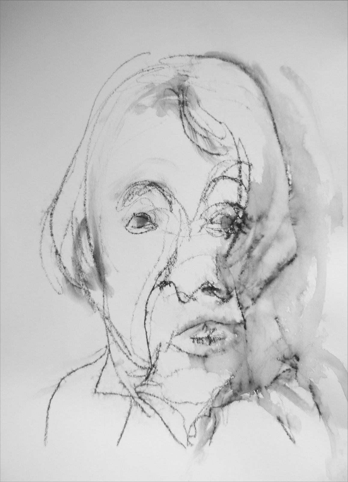 Bij mijn tweede poging probeer ik welbewust te coördineren waar ik het potlood zet. Het opschroeven van de controle geeft een aanzienlijk beter resultaat. Hoewel vervreemdend verwrongen lijkt het portret toch op mijn moeder. Nog even gericht wat (ongecontroleerd) water erover spuiten en met de vingers uitvegen en het portret is af. Mijn moeder is inmiddels ook klaar met tekenen. Ik herken mijn krullenkop. De ogen zijn intens, geprononceerde neusgaten. Bij mijn mond had ze blijkbaar geen zin meer, die is alleen dun opgezet. De mensen van ‘Zolang ik er ben’ zijn onder de indruk van haar tekening. Ze vertellen meer over het project en wat ze ermee beogen: mensen met Alzheimer een stem geven, te vertellen hoe het is om met Alzheimer te leven, met kunst als ingang daartoe. Mijn moeder luistert geïnteresseerd toe. Omdat haar taal en sociale reacties nog zo goed zijn, komt ze niet bepaald dement over, ook niet voor haarzelf. Ze merkt wel dat haar geheugen achteruit gaat en dat ze zich “de laatste tijd zo wazig voelt”.